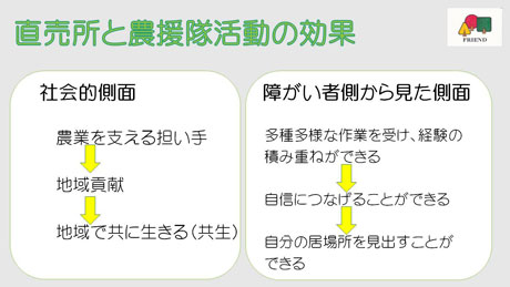 三本の木フレンドは農業を基本に捉え、農園隊と称し近隣農家への農作業の手伝いを行う他、畑を借りて自分たちで野菜・果物の栽培を行う他、近隣農家さんに会員になってもらい直売所を開設し、自分たちで栽培・収穫した野菜・果物も加工して販売しています。農作業が出来ない利用者には、屋内で3種類の内職作業を行い、利用者の障害特性により作業内容を決めています。その他に、地域の活性化のために、農業高校と連携し高校生が栽培した野菜類を高校生自ら直売所で販売するイベントを週1回行い、福祉と高校の連携が話題になっています。