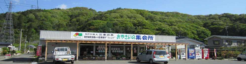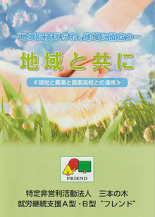 三本の木フレンドは農業を基本に捉え、農園隊と称し近隣農家への農作業の手伝いを行う他、畑を借りて自分たちで野菜・果物の栽培を行う他、近隣農家さんに会員になってもらい直売所を開設し、自分たちで栽培・収穫した野菜・果物も加工して販売しています。農作業が出来ない利用者には、屋内で3種類の内職作業を行い、利用者の障害特性により作業内容を決めています。その他に、地域の活性化のために、農業高校と連携し高校生が栽培した野菜類を高校生自ら直売所で販売するイベントを週1回行い、福祉と高校の連携が話題になっています。